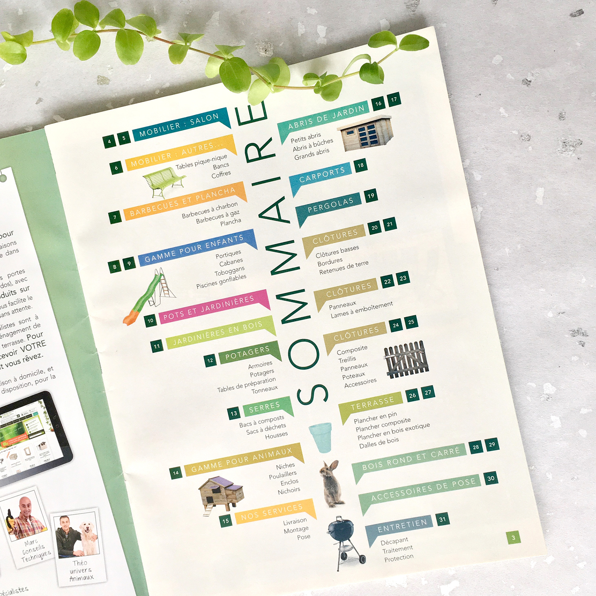 Refonte du logo et de la charte graphique du catalogue de cette enseigne de magasin d'aménagement extérieure à Lesquin.