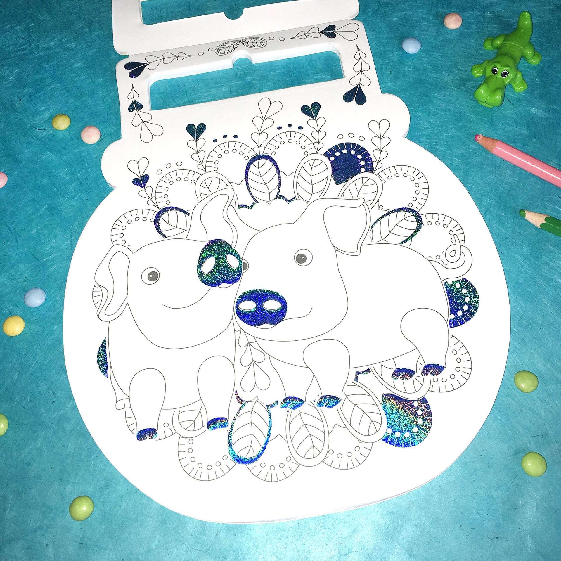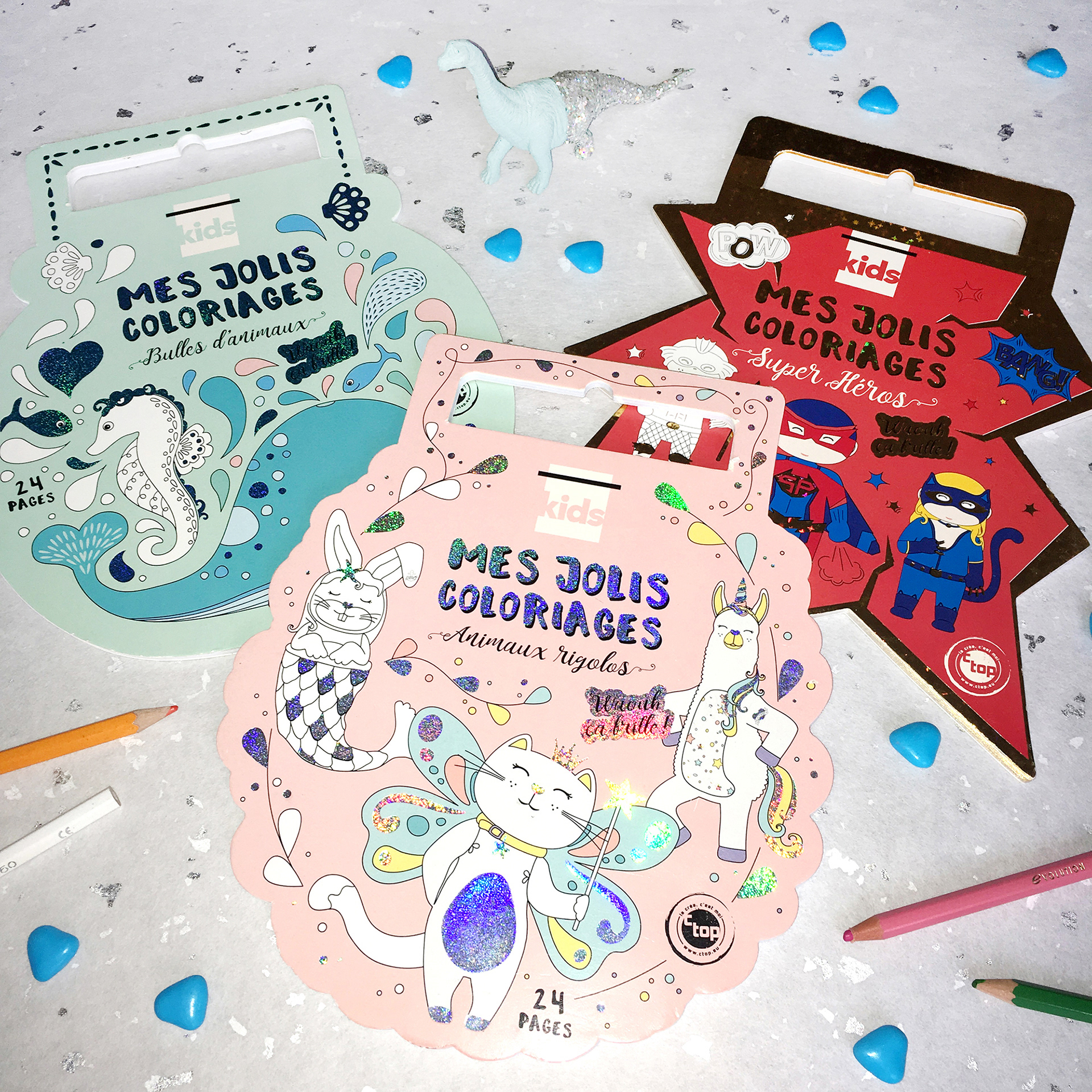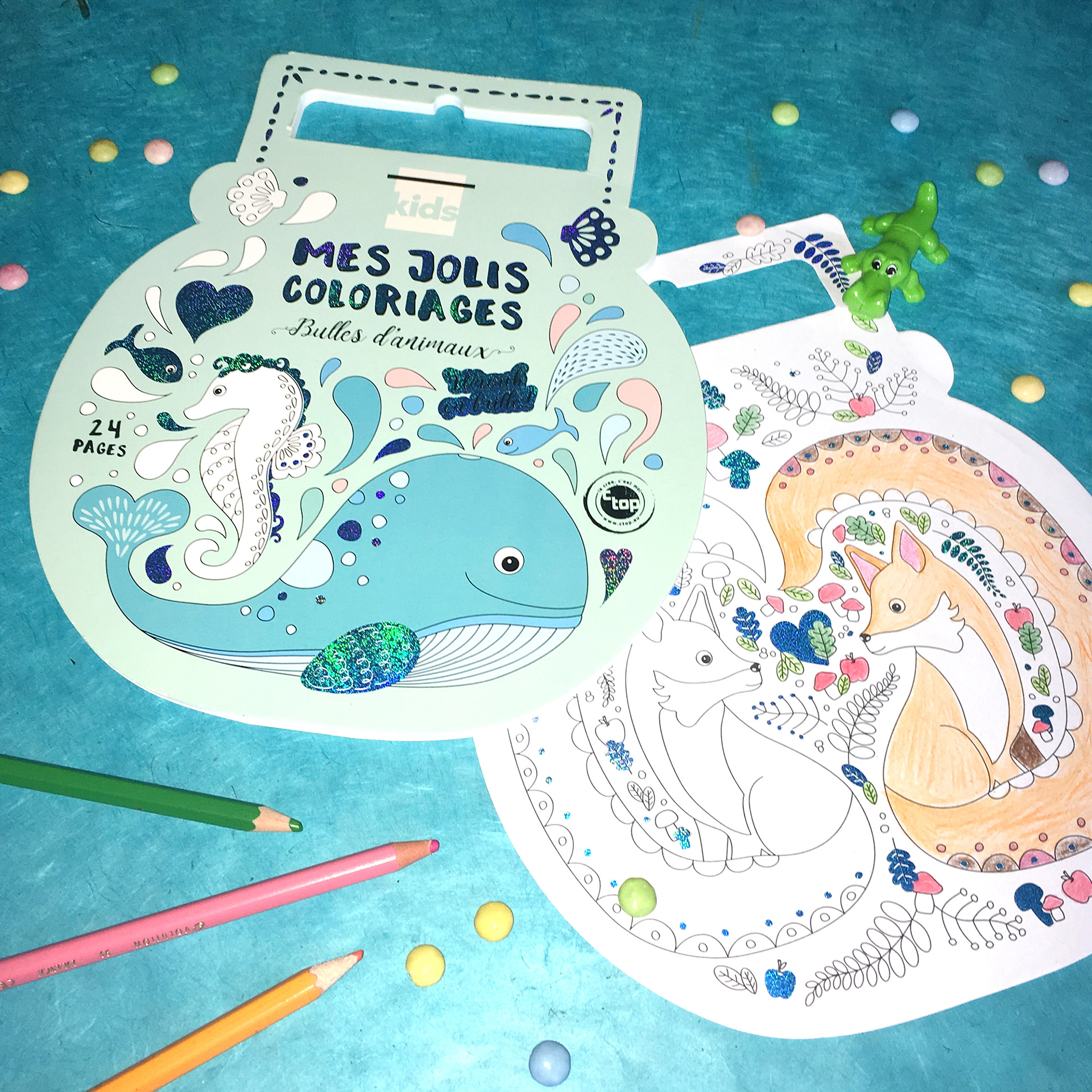 Création de 3 carnets de jolis coloriages pour enfants dont le "Bulles d'animaux" avec des 12 pages d'illustrations différentes comportant une impression holographique bleutée.