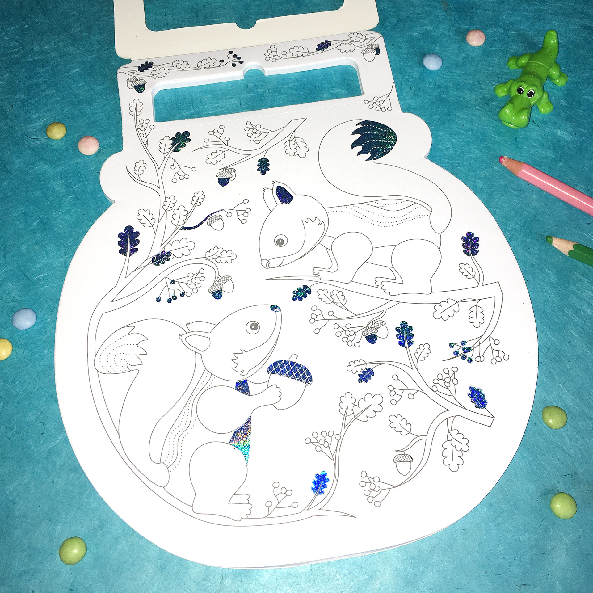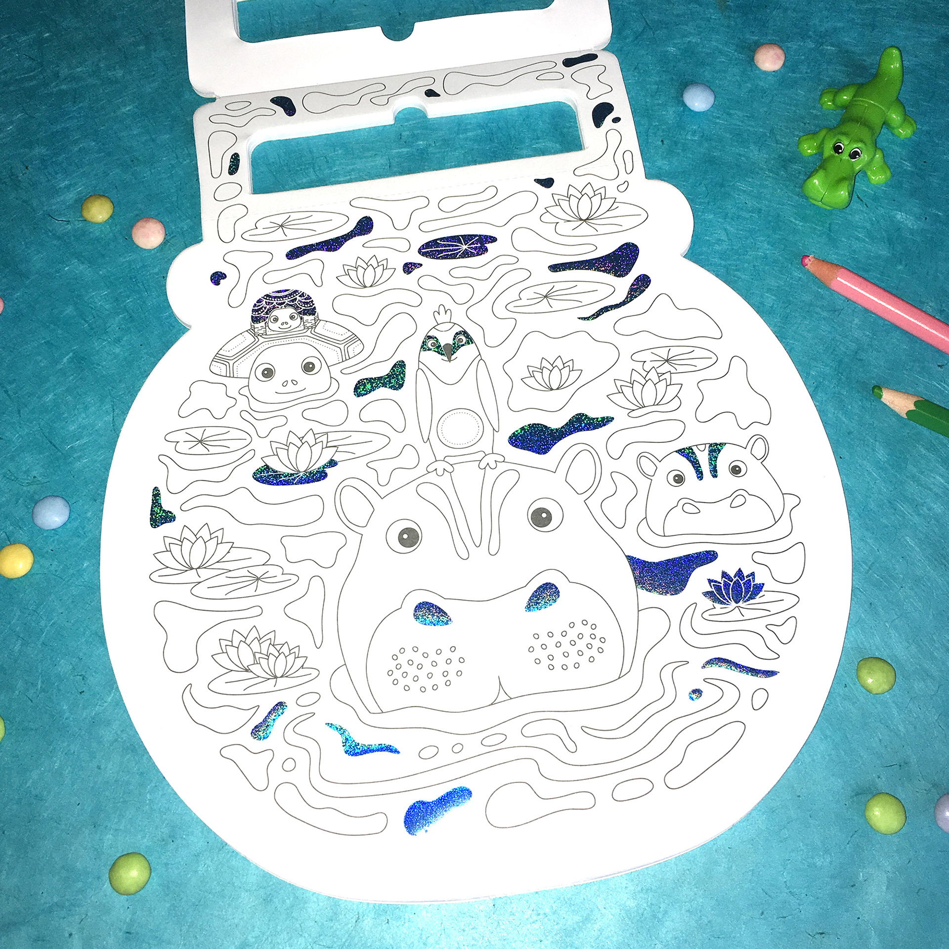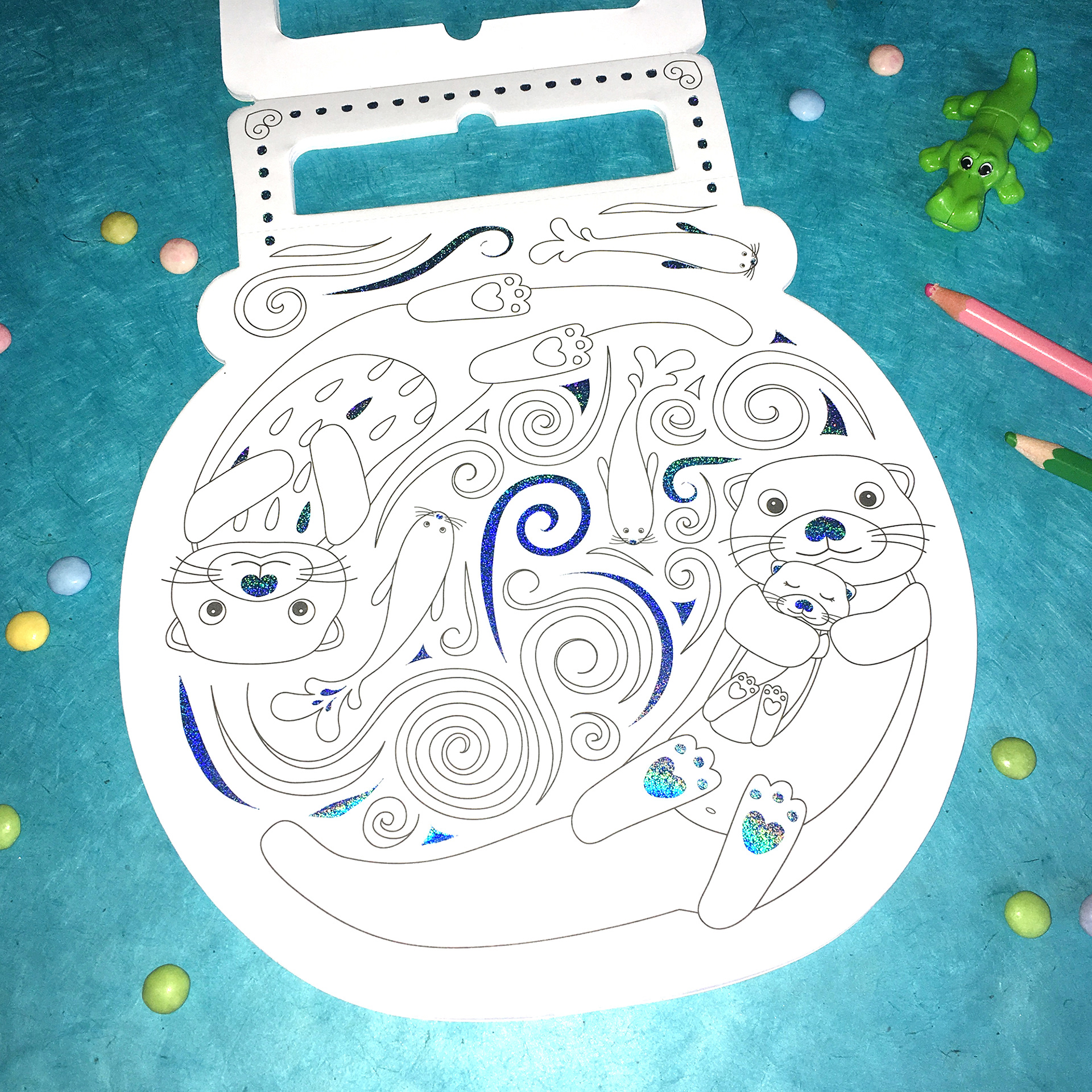 Création de 3 carnets de jolis coloriages pour enfants dont le "Bulles d'animaux" avec des 12 pages d'illustrations différentes comportant une impression holographique bleutée.