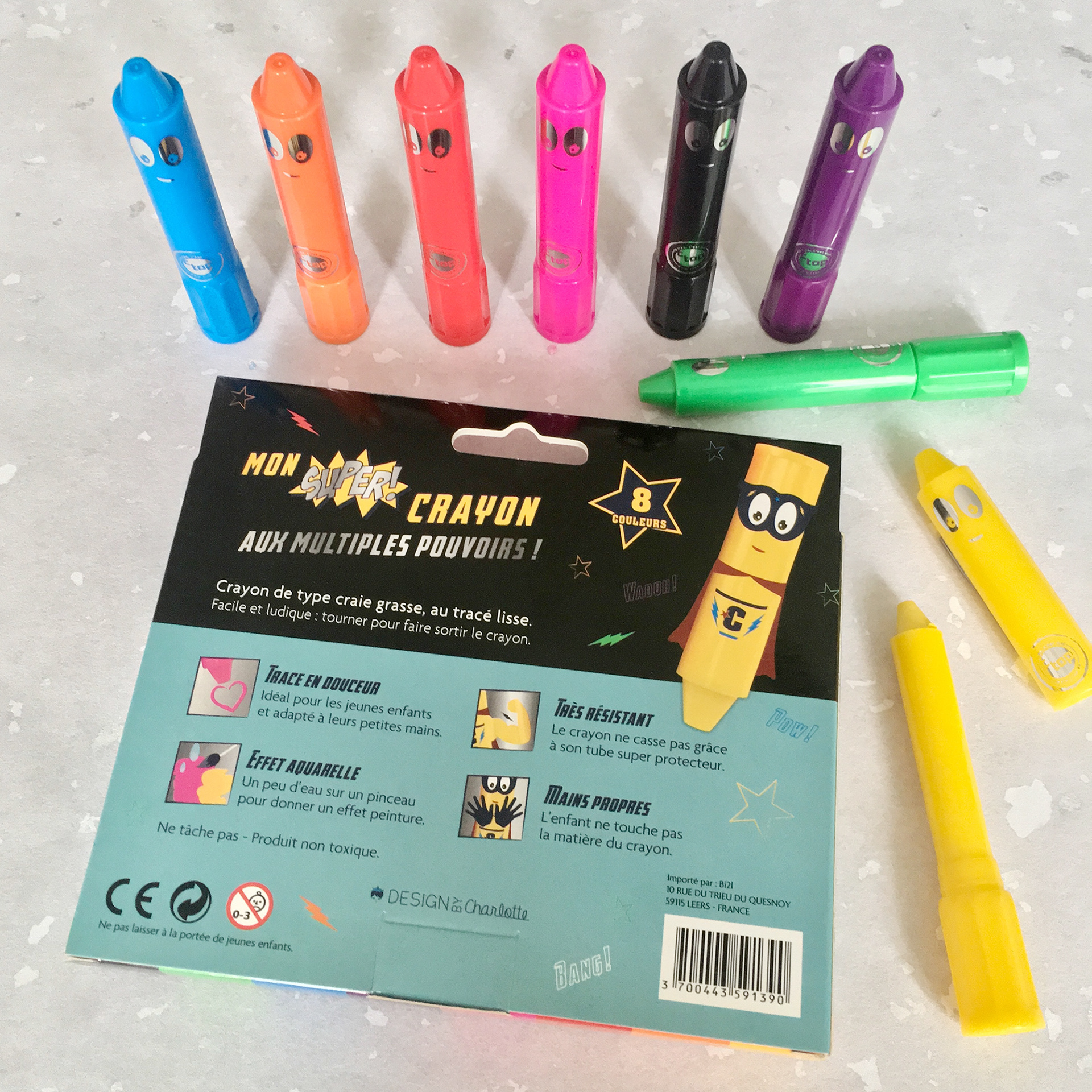 Concept et design du packaging de "Mon super crayon" aux multiples pouvoirs ! Avec des illustrations impactantes pour attirer les enfants et donner envie aux parents de faire des loisirs créatifs en famille.