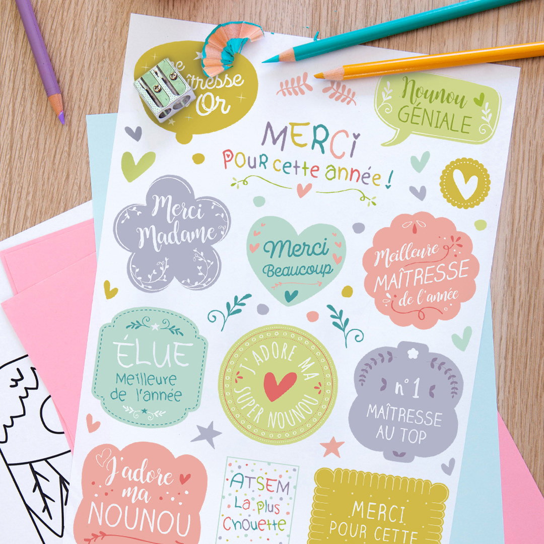 Création de gommettes MERCI pour cette année ! Pour permettre aux enfants de décorer des cadeaux pour celles et ceux qui ont pris soin d'eux : Maîtresse, maître, nounou, atsem, instit, prof...