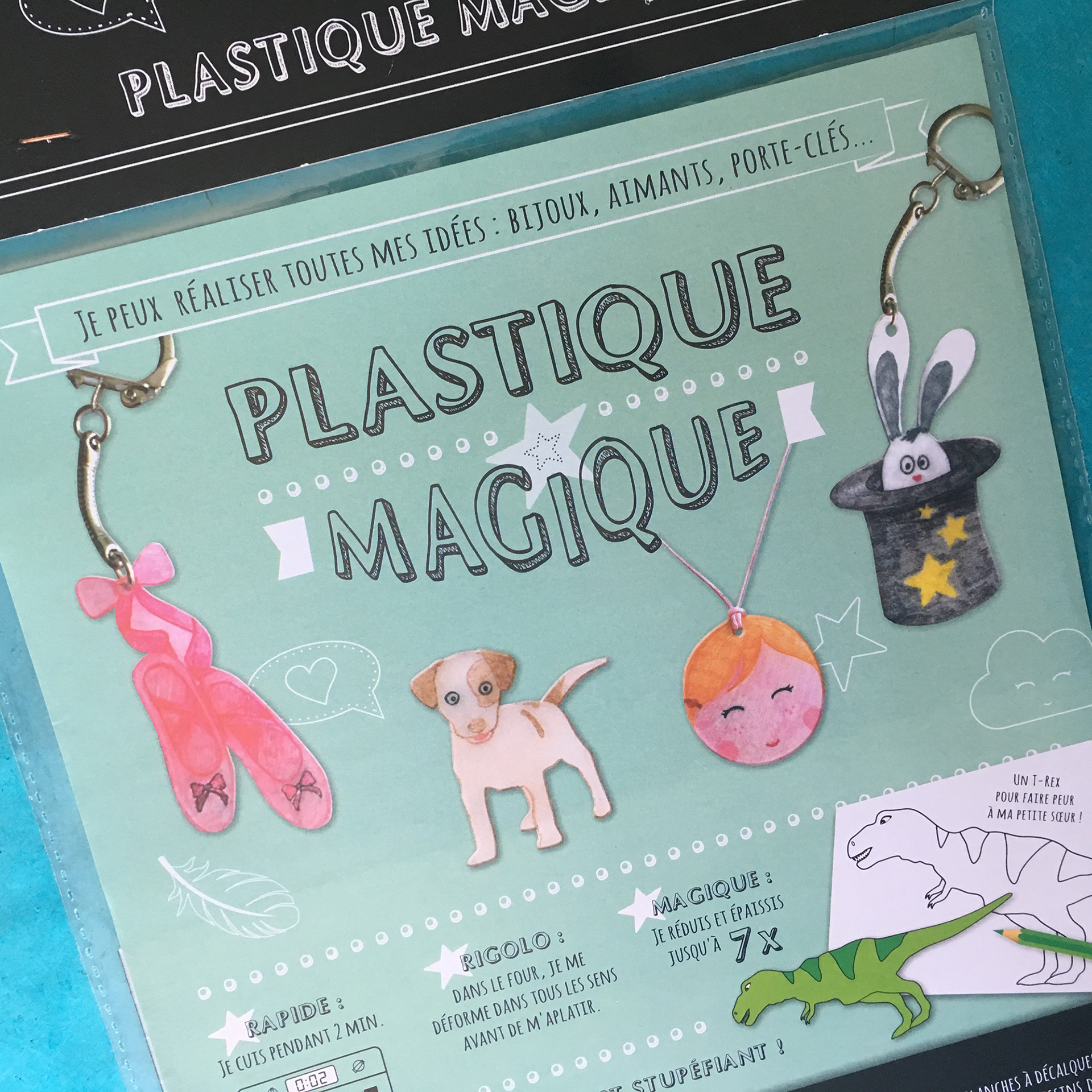 Design du packaging du Plastique Magique pour enfants ainsi que des 6 planches d'illustrations pour inspiration en loisirs créatifs.