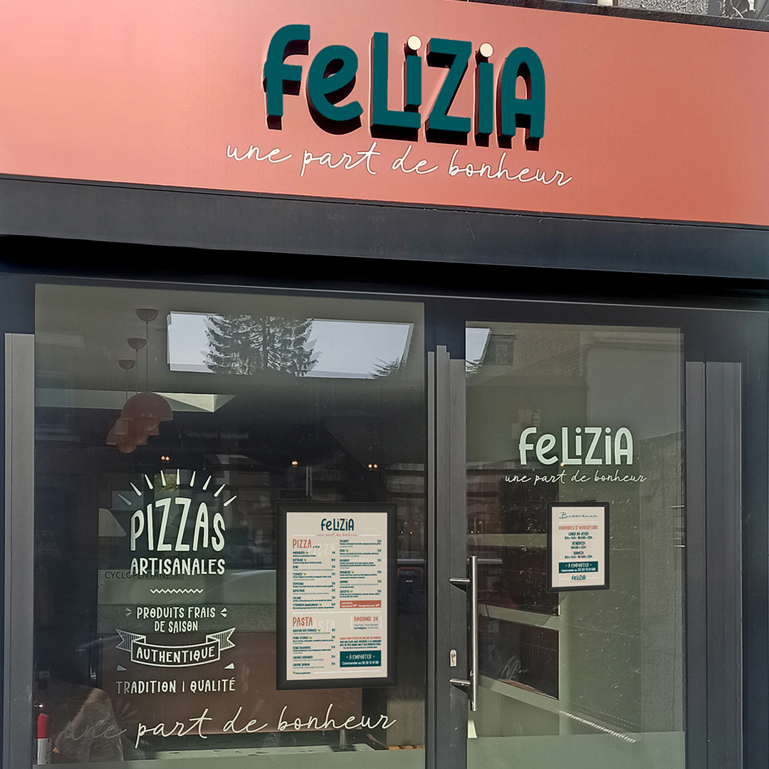 Création du logo, charte graphique, enseigne et vitrine d'une pizzeria à Marcq en Baroeul, à côté de Lille.
