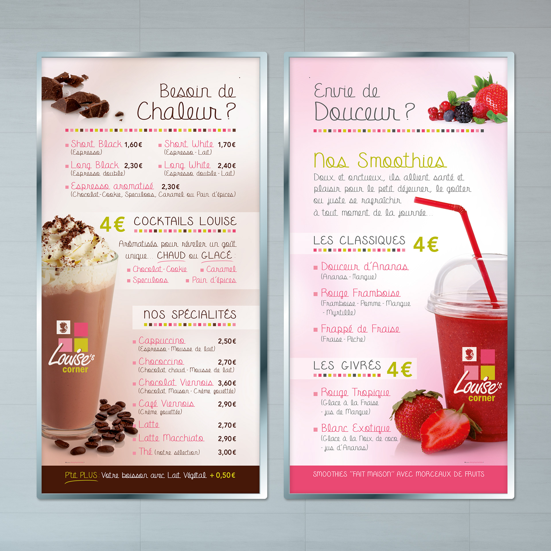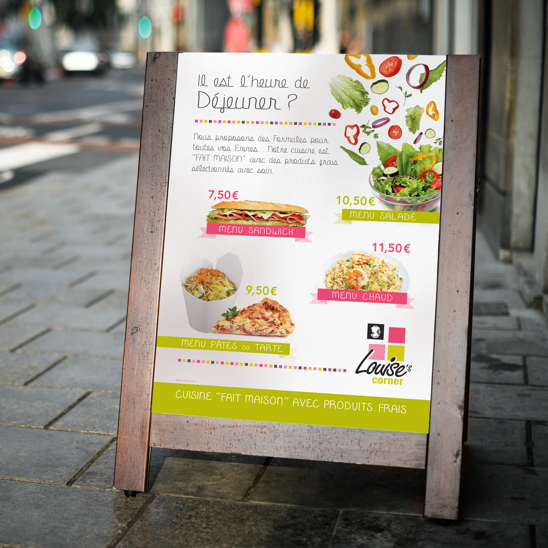 Conception des panneaux de façade et stop Trottoir avec présentation des différentes formules pour cette enseigne de restauration rapide basée dans le vieux Lille.