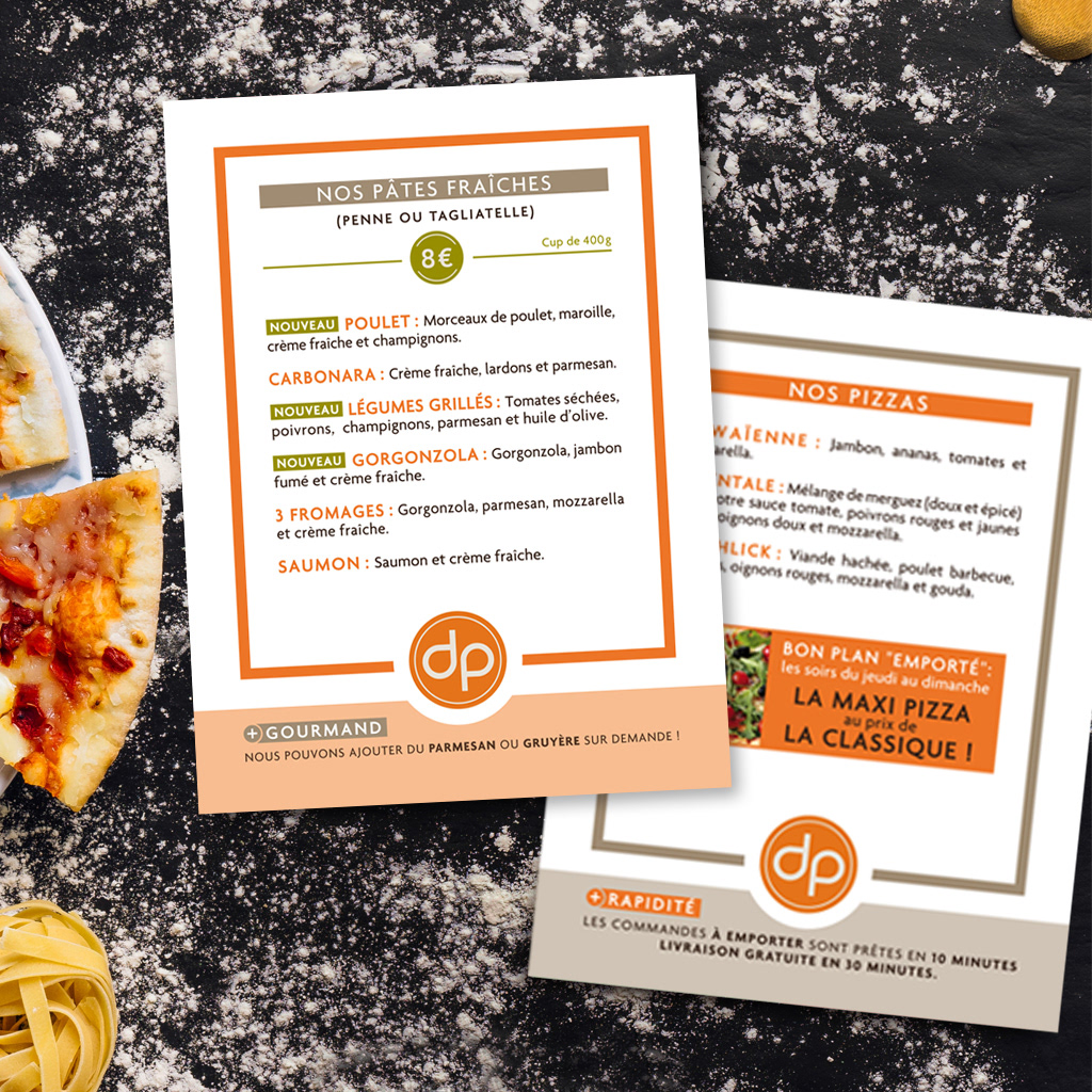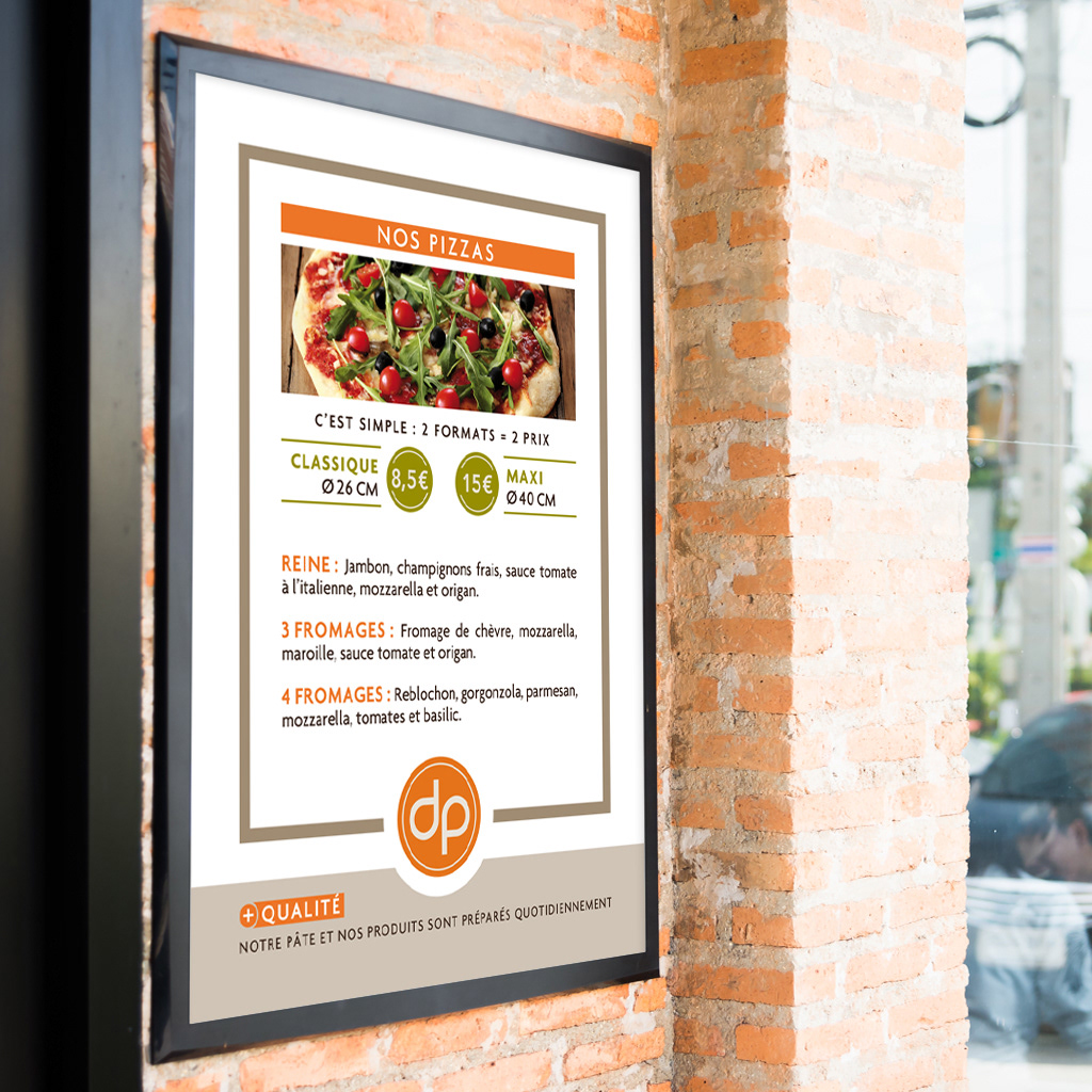 Création de l'identité visuelle, affiches pour cette pizzeria de Roubaix. Conception d'un menu attrayant et facile à lire avec des descriptions appétissantes.
